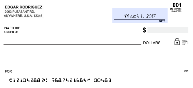 Your personal information is printed here. Never list your social security number on your printed checks.