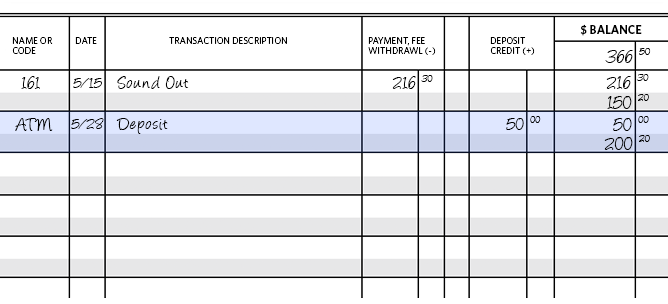 Record the code, date, description and the amount of the deposit. Add the amount of the deposit to your balance and write in the new balance.